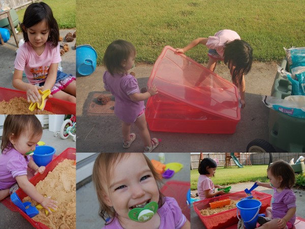 This week, I crossed off a project on my "I can do that myself and for cheaper," list. About a week ago, the girls and I were visiting a friend. While they were playing outside, they found the sandbox, and fell in love with it. I remember seeing those huge sandboxes at stores and thought, "Now really, my kids do not need anything that big. I could make one myself." And that's just what I did:
